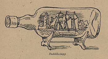 Er fischte die Flasche aus dem Schaum der heranflutenden Welle. "Das ist so recht eine Flasche für ein Buddelschipp!" sagte er. "Wißt ihr, diese wunderbaren Kunstwerke, die die alten Segelschiffsmatrosen während der langen Passatfahrten nach Übersee herstellten! Sie bastelten einen schmalen Schiffsrumpf, der durch den Hals der Flasche ging, und Masten mit Tauwerk aus feinen Fäden. Dann brachten sie grünlich-blau gefärbten Kittbrei in die liegende Flasche, formten daraus stürmische See, die sie mit dünnen Pinseln durch den Flaschenhals mit weißen Schaumkämmen bemalten. Sie brachten dann den Schiffsrumpf durch den Hals der Flasche samt den liegenden Masten, richteten im Innern durch Zug an den Fäden die Masten auf und die Rahen zurecht, stopften wieder den Korken in den Hals und versiegelten ihn. Dann war das Flaschenschiff fertig. Besonders geheimnisvoll schien es in diesen grünen alten Literflaschen auf der Kommode der Liebsten weiterzusegeln. - Ich hätte Lust, diese Flasche mitzunehmen und einmal selbst zu versuchen, mir solch Buddelschipp anzufertigen. Aber das ist natürlich nicht so einfach, wie ich es euch eben erzählt habe."