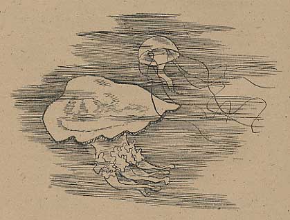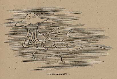 Wie zauberhaft sah die rötliche Ohrenqualle aus! Nicht minder schön war die blaue Nesselqualle, die meterlange Fangfäden hinter sich herzog. Aber sie hüteten sich, ihnen nahezukommen, seit Jan einmal mit den Fäden in Berührung gekommen war. Das Tier hatte sich an seinen nackten Oberschenkeln festgeheftet, und ein schauderhaftes Brennen hatte sich bald darauf eingestellt und tagelang angehalten.