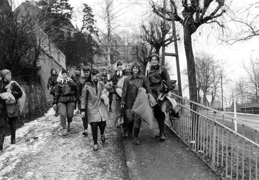 X. ZMF 1970, Dresdner Kanutinnen auf dem Weg zum Start der zweiten Etappe in Leisnig. Man beachte die mitgeführte Luftmatratze.