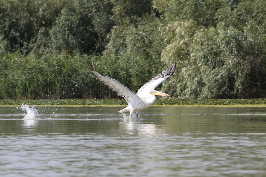 Kraftvoll setzt der Pelikan zum Flug an.