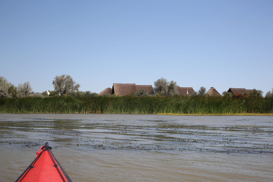 Neue Herrlichkeit im Donaudelta. Die schilfgedeckten Häuser gehören zu einem neuerbauten Ferien-Resort und würden auch auf Hiddensee oder Rügen eine gute Figur machen.