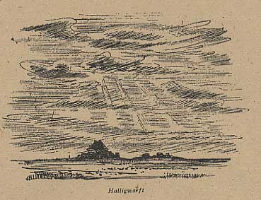 Nach kurzer Beratung faßten sie den Entschluß, die Überquerung dieser gewaltig breiten Wattstrommündung zu wagen. Sie wählten als Ansteuerungspunkt die Hallig, um nicht zu weit nach draußen zu kommen. Nach stundenlanger Paddelei über nur leicht bewegtes Wasser kamen sie in die Nähe der jenseitigen Wattgründe und sahen nun schon die niedrige Halligfläche wie einen Strich und darüber die einsame Warft mit dem einzigen Haus aufragen. Heveraufwärts erkannten sie die Hallig Südfall, die auch nur ein Haus auf einer Warft besitzt und vor der die Reste Rungholts im Watt liegen. Als Fata Morgana in der Luft schwebend, glaubten sie ganz schwach noch Nordstrand und Pellworm zu erblicken, oder besser, sie ahnten einzelne Punkte davon. Nur der alte Kirchturm Pellworms war deutlicher zu erkennen.