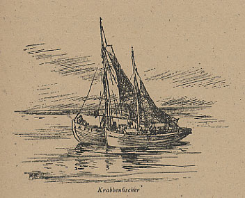 Ein Motorfischerboot kam ihnen entgegen. Es war ein Krabbenfänger. "Du", rief Jan, "wollen wir mal versuchen, ob wir frische Krabben bekommen?" "Das ist eine glänzende Idee", antworteten die beiden anderen. Das Pochen des Glühkopfmotors kam näher. Das Krabbennetz war zum Trocknen am Mast aufgehängt, und der große Krabbentopf dampfte. Heio rief den Fischer an: "Können wir nicht ein paar Pfund Krabben bekommen?" "Ja, kommt man längsseit!" Während er ihnen in einer riesigen Tüte, die er merkwürdigerweise an Bord hatte, die Krabben abwog, erzählte er ihnen mit pfiffiger Miene und lustigem Augenzwinkern plattdeutsche Döntjes. Als sie sich über die schönen großen Krabben freuten, meinte er: "Jo, wi kakt ok jümmers so'n paar olle rostige Nagels mit, denn ward se scheun rot!" Lachend schieden sie, der Kutter töffte weiter, und sie sahen noch das lohbraune Netz über dem schwarz-weißen Bootsrumpf mit dem rauchenden Schornstein des Krabbentopfes vor der graugrünen Salzflut, bevor sie weiterfuhren.