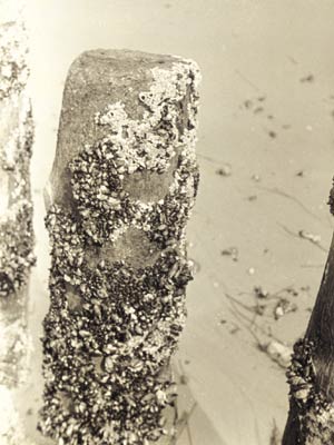 Die Seepocke ist ein festsitzender Krebs mit weißem Kalkgehäuse und einer durch zwei Klappen zu schließenden Öffnung an der Oberseite, aus dem die umgewandelten Beine des Krebses herausschlagen und mit frischem Atemwasser auch Planktonnahrung herbeistrudeln.